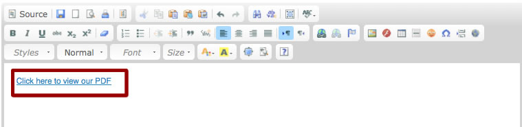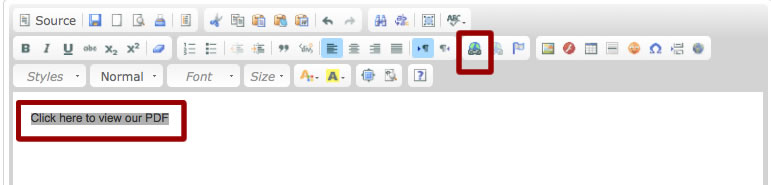 1) Type in what you want the link for your PDF to be called. In the example below we want the link that loads the PDF to say "Click here to view our PDF". But in your example you might want to call this "Click here to view our brochure" or whatever you prefer.