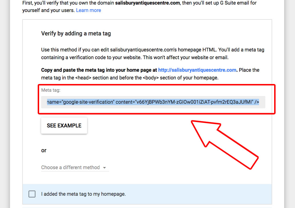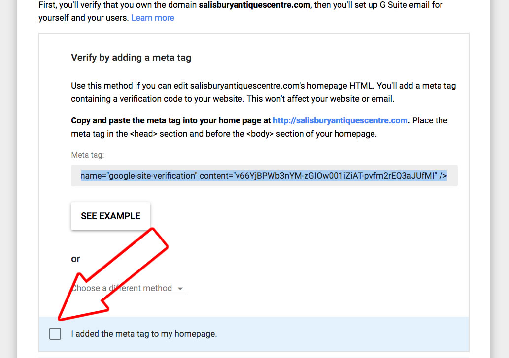f) Return to the Google Admin console and tick the box which says "I added the meta tag to my home page"