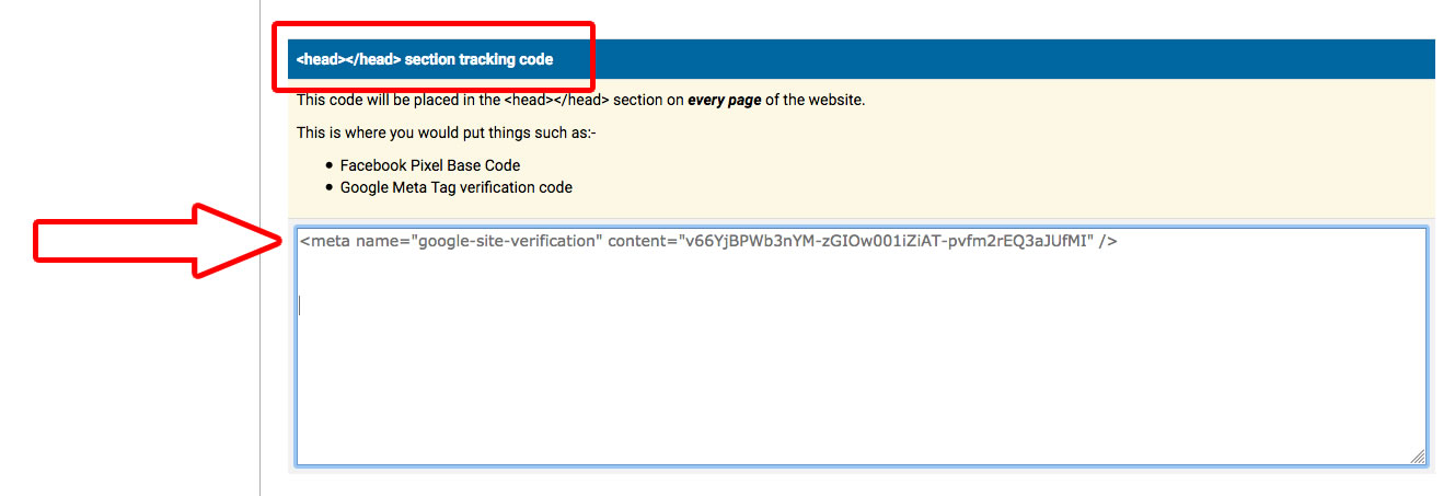 e) In the section titled "<head></head> section tracking code", paste in the code. If there is already some code in this box, paste it in addition to the existing code