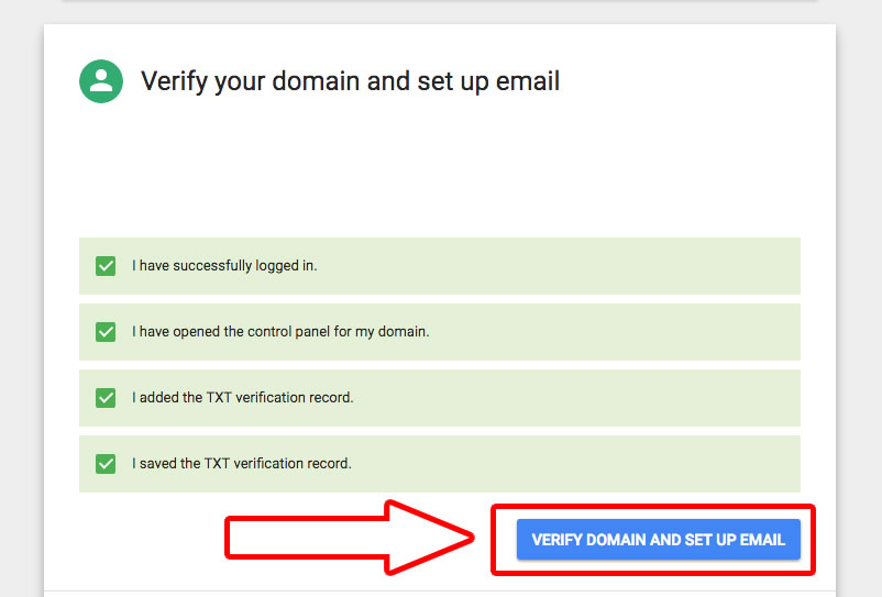 b) So tick the remaining boxes about MX records etc, and press VERIFY DOMAIN AND SET UP EMAIL.