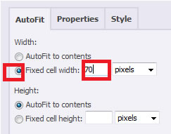 4) Make sure that ?Fixed cell width? is selected, and then input the width in the box to the right. You can specify the width in either pixels, or percentage. Eg if you wanted the cell to be 20% of the entire table then you could put 20 in this box and choose ?percent? in the drop down box