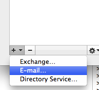 This will bring up a pop up window showing all of the currently set up email accounts - in the bottom left hand corner you should see a plus symbol - click on this to produce a drop down and select the `E-mail...` Option.