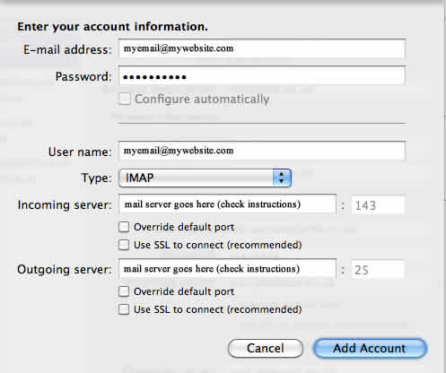 1) You will be prompted for all of the information needed to set up your e-mail account. The following information should be put into the corresponding fields.