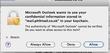 2) You can choose whether or not to allow Microsoft Outlook to store confidential information about your email account on your keychain - this will only store your log in information and will not affect your email account`s functionality.