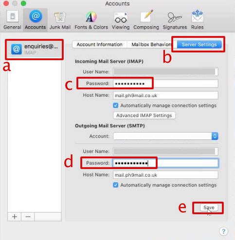 c) Delete the password, then enter the new password underneath "Incoming Mail Server (IMAP)" (shown in box "c" below)