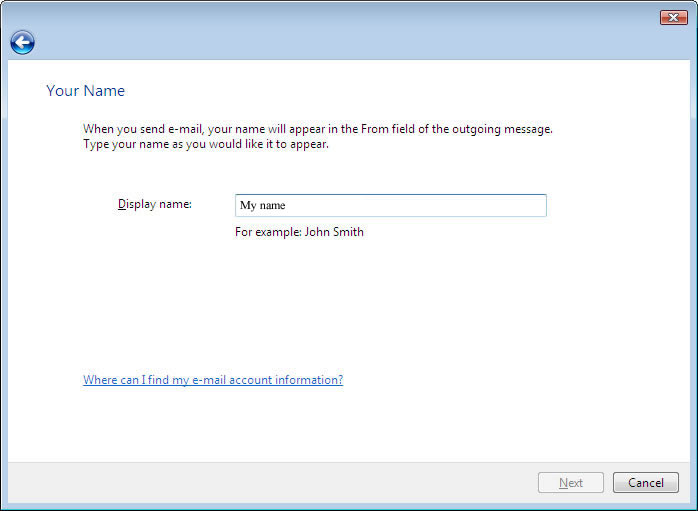 4) In the Your Name window, type in the name you want your recipients to see when they receive your e-mails, then click on Next.