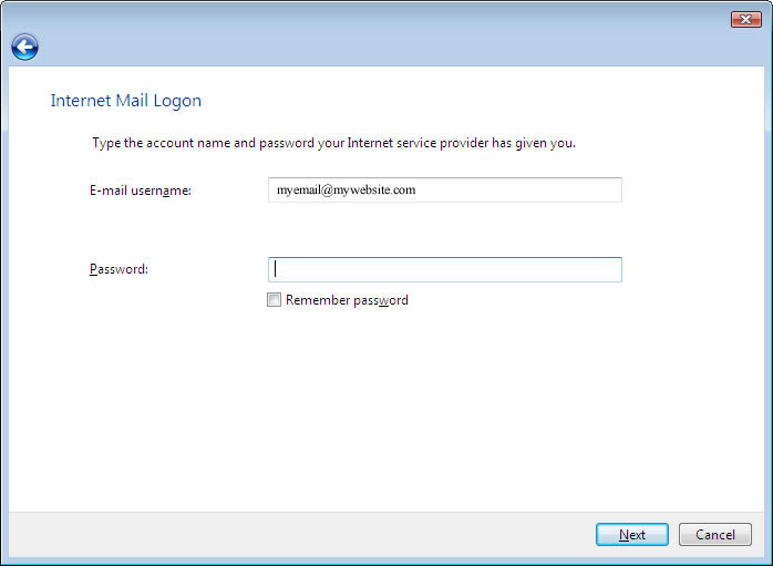 7) In the Internet Mail Logon window, enter your username and password (you don`t need to enter the password, but if you do, you will automatically log on to the e-mail server everytime you open Windows Mail as long as the Remember Password box is ticked).