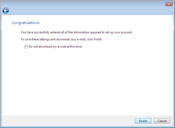8) You should see the following screen; make sure Do not download my e-mail and folders at this time box unticked, then click Finish.